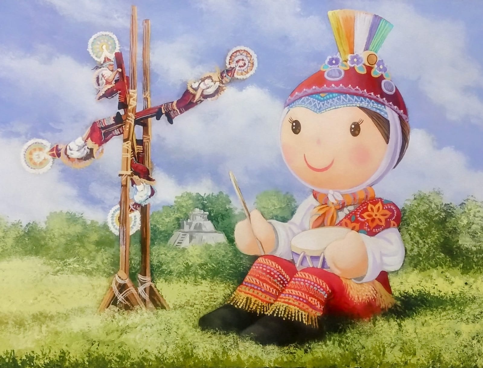 La obra Ternura Papantla, del artista plástico Roberto Benítez, rinde homenaje a una de las tradiciones más emblemáticas del estado de Veracruz: la ceremonia de los Voladores de Papantla. En ella, la delicadeza de la muñeca María se entrelaza con el ímpetu de esta danza ancestral, dando como resultado una composición llena de color, movimiento y emoción.